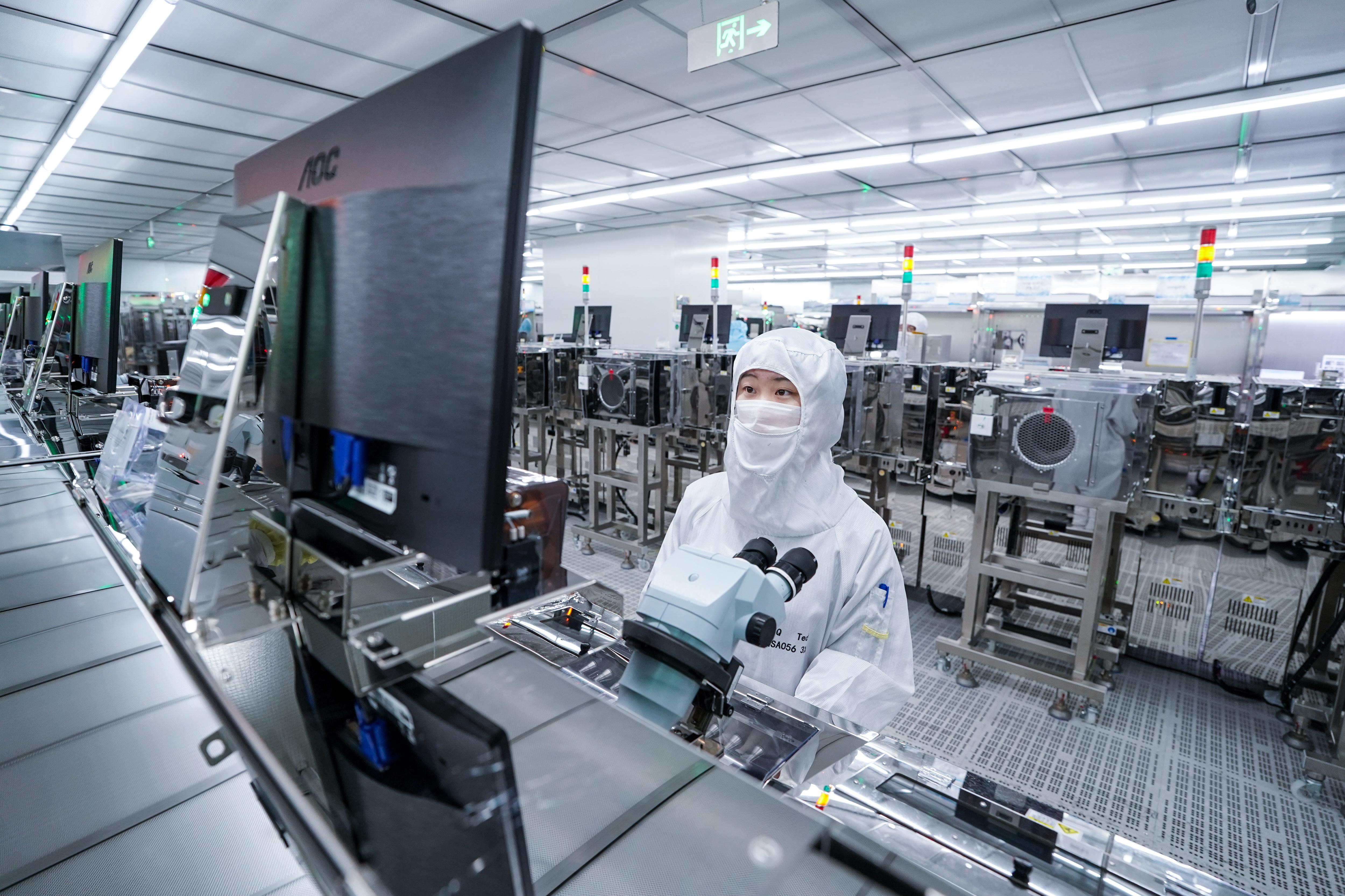 在昆山丘钛微电子科技股份有限公司,工人在智能设备摄像模块生产车间作业(10月9日摄)。 新华社记者 李博 摄