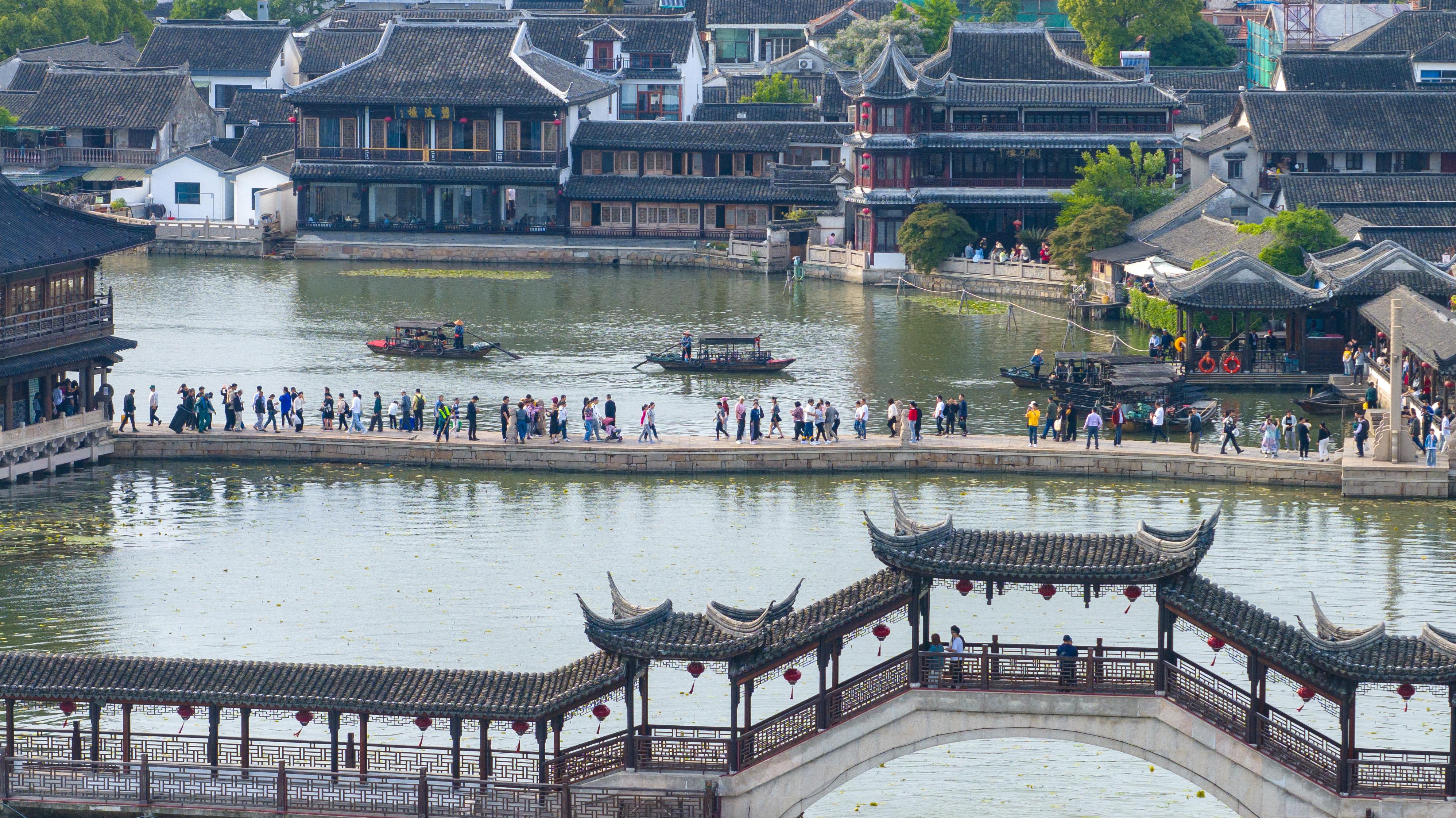 游客在昆山锦溪古镇休闲游玩(5月3日摄,无人机照片)。 新华社发(王须中 摄)