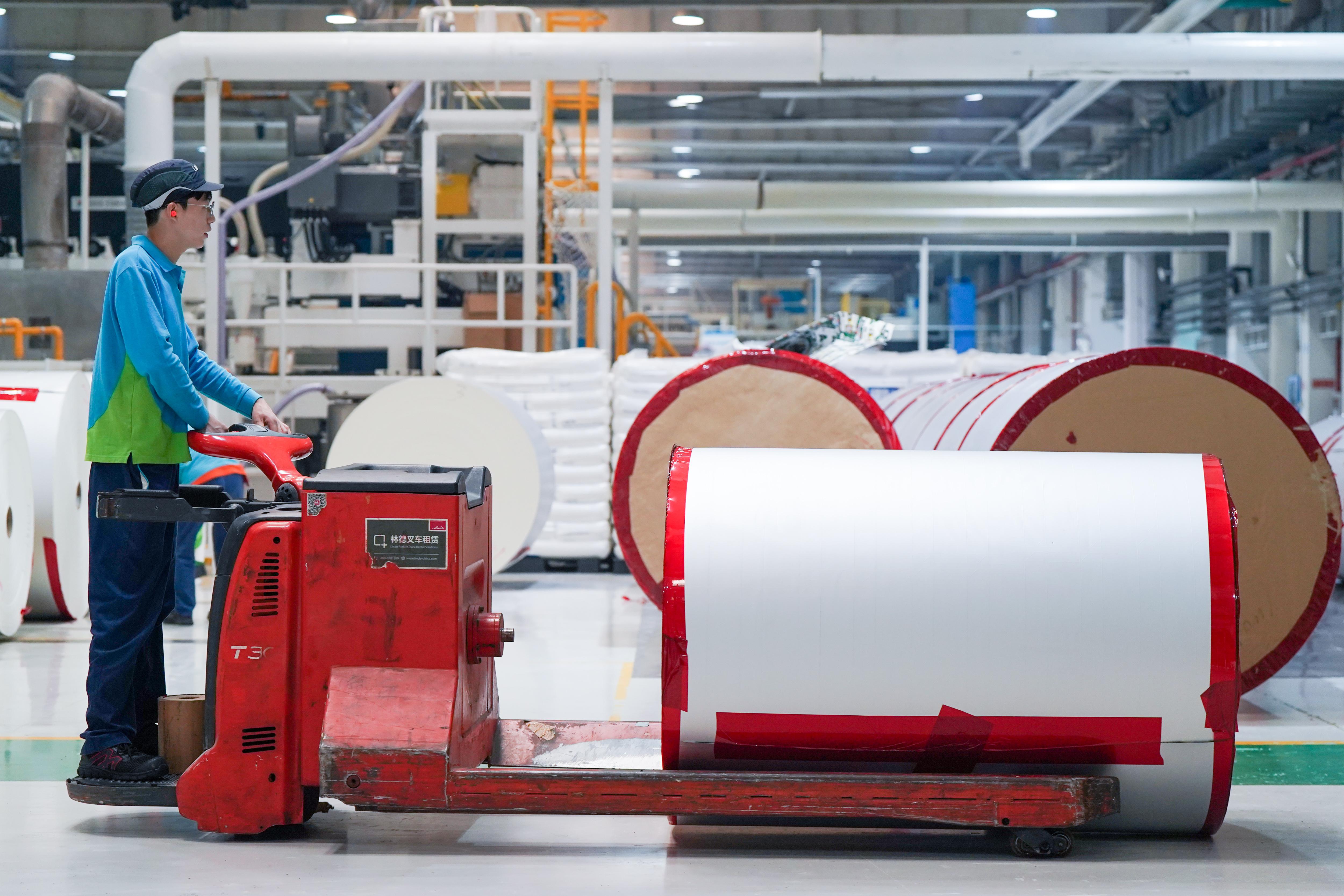 在乐美包装(昆山)有限公司,工人在液体无菌包装材料生产车间内作业(10月9日摄)。 新华社记者 李博 摄