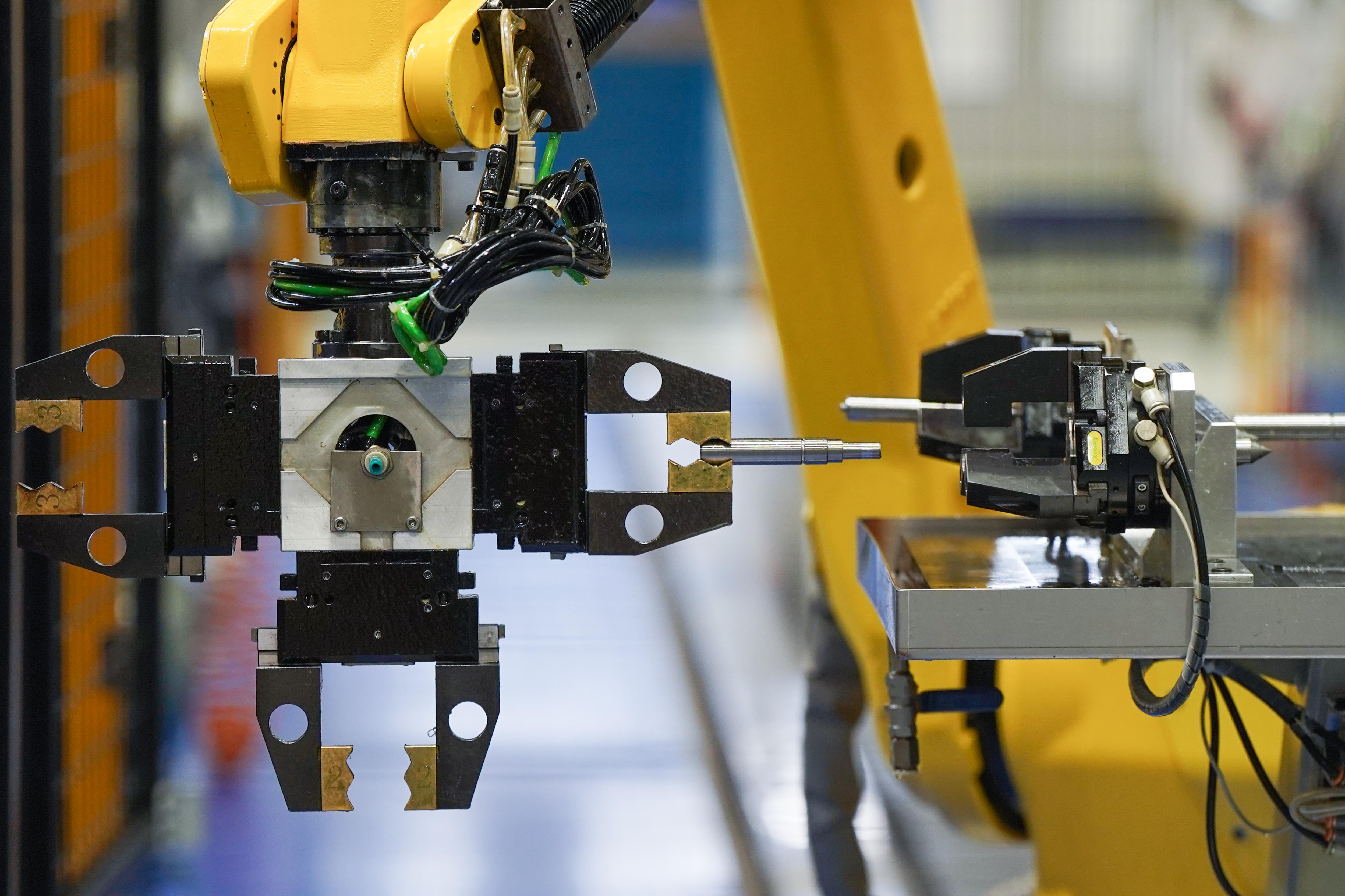 在位于江苏昆山的马斯特模具有限公司,自动化机械臂在喷嘴标准件车间自动化生产线作业(10月9日摄)。 新华社记者 李博 摄