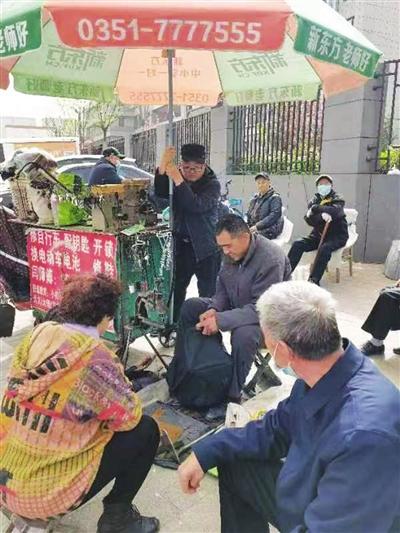 焦师傅摊位对面,是另一个修车修鞋的小摊点,摊点边上围着一群老街坊,边看师傅干活儿边唠嗑。“附近谁家有房出租,谁家儿考上了研究生,政府最近出了什么好政策……”大家聊天的内容五花八门,显然是个信息集散地。“我们每天都要来这儿聊聊天,生活中已经离不了这个小摊点。”在记者采访的十几分钟内,有3个学生模样的少年来给车胎打气,自己拎起气筒打气,打完后,骑车走人,一看就是老熟人,知道师傅不收钱。