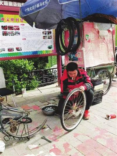 “不仅能修车补胎,有时候小家电坏了,也来找他。”换车胎的阿姨是位老顾客,“即使是下雪天,他都蹲在地上修车。现在能找到一个修理摊不容易,方便就好。”