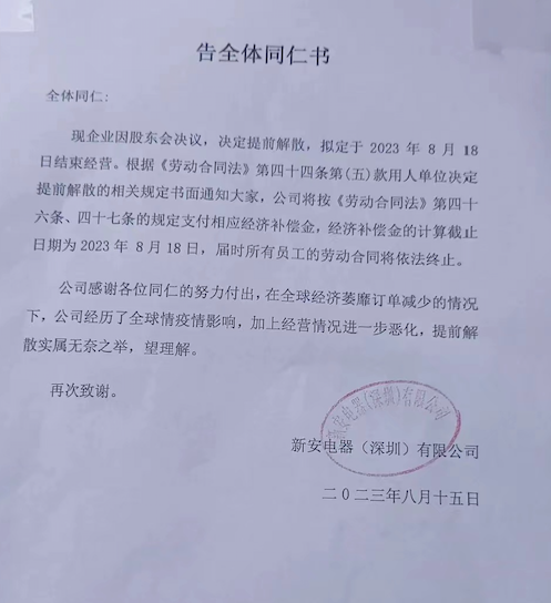 【独家】因订单减少,深圳港资千人家电大厂宣布提前解散