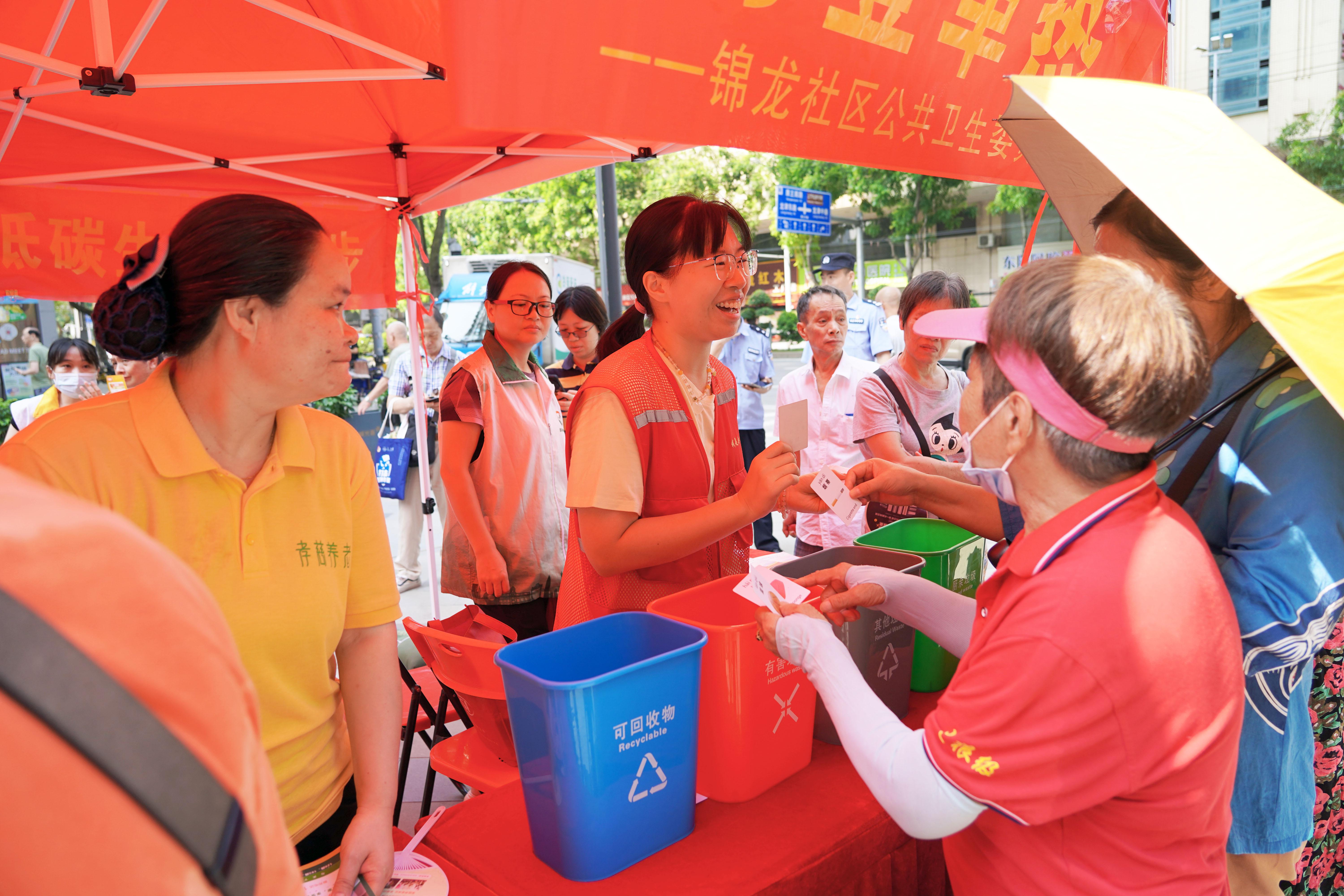 “耆”乐融融关爱困难长者中秋游园摊位内,志愿者与社区长者玩垃圾分类小游戏