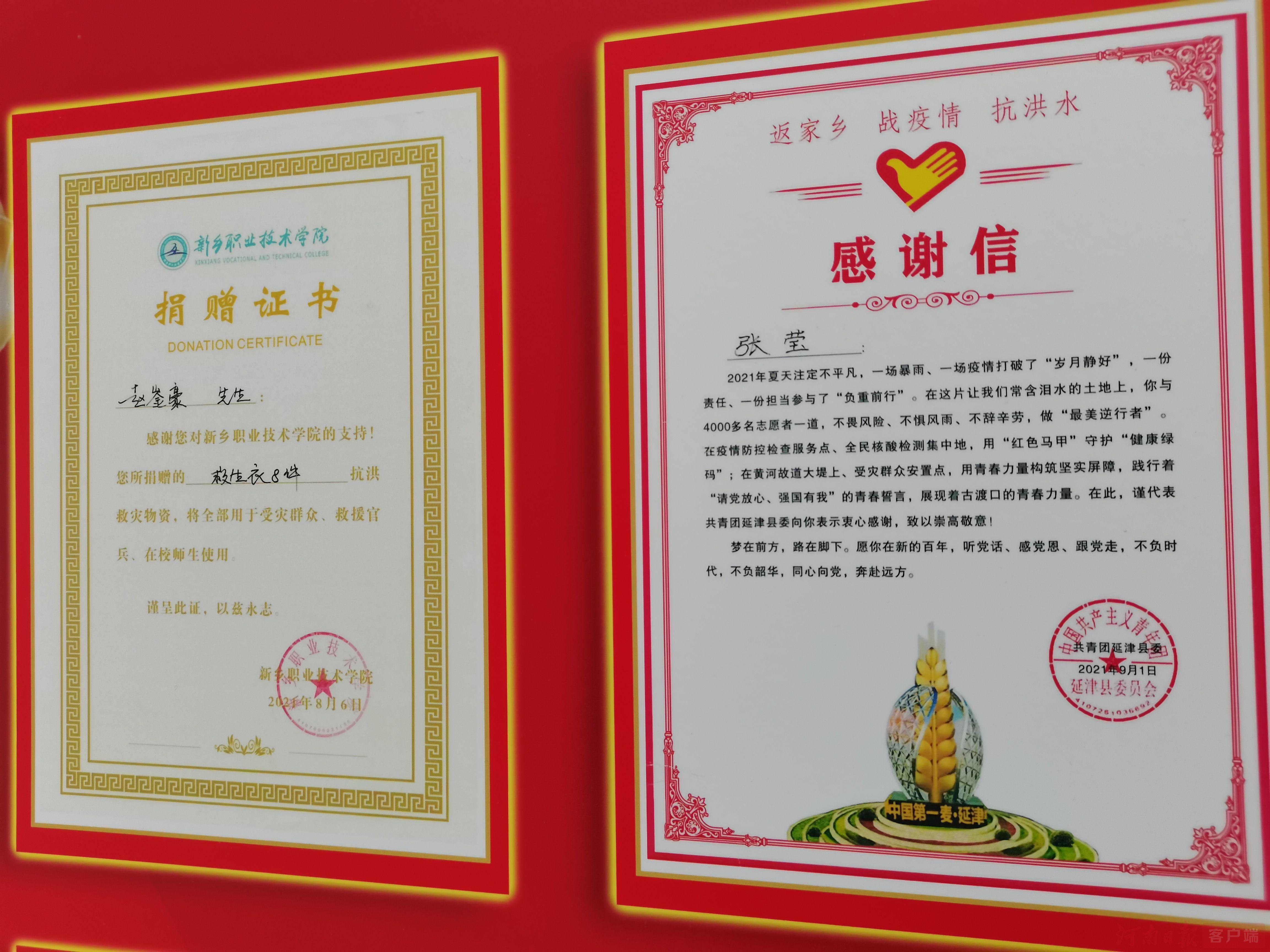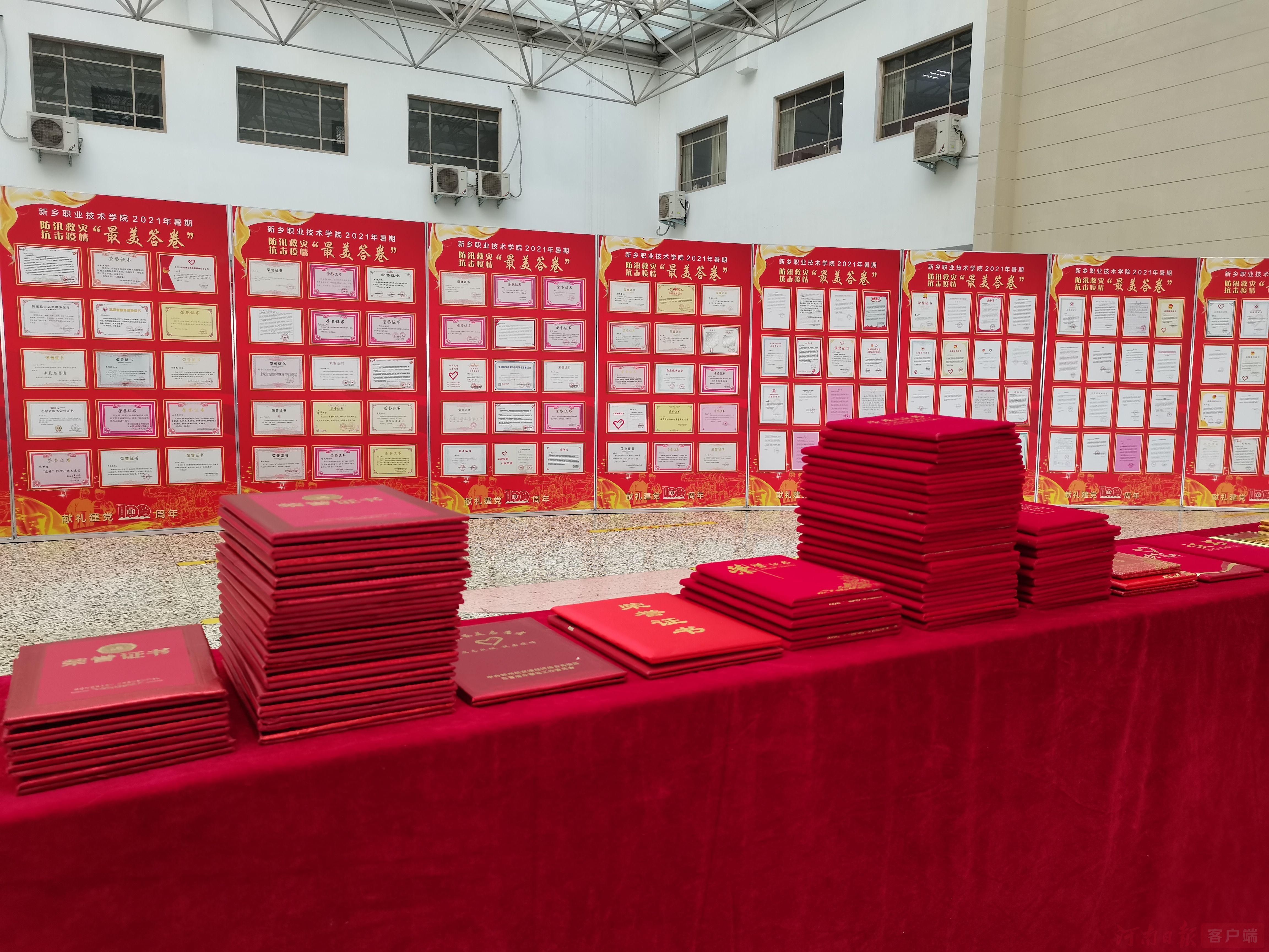 当天,在新乡职业技术学院举行的暑期防汛救灾和抗击疫情先进个人表彰活动中,该校综合楼一楼大厅展出的数百份感谢信(荣誉证书)超长展板惹人注目:今年暑假,在接连遭遇暴雨洪灾、疫情反弹时,该校及时号召学生积极投身志愿活动,就地服务家乡,用自己的付出提交了一份非常时期的社会实践“最美答卷”。