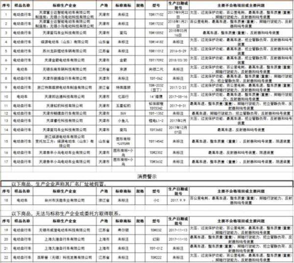 此外,标称台州市沃趣车业有限公司生产的一款电动车,被抽检企业声称厂名厂址被假冒;无锡市威澄电动车科技有限公司生产的“希尔顿”电动自行车、以及标称上海久煌自行车有限公司、西斯普(无锡)科技发展有限公司生产的产品,抽检中发现多个不合格项目,但无法与标称生产企业取得联系,市市场监管局提醒消费者谨慎购买上述产品。