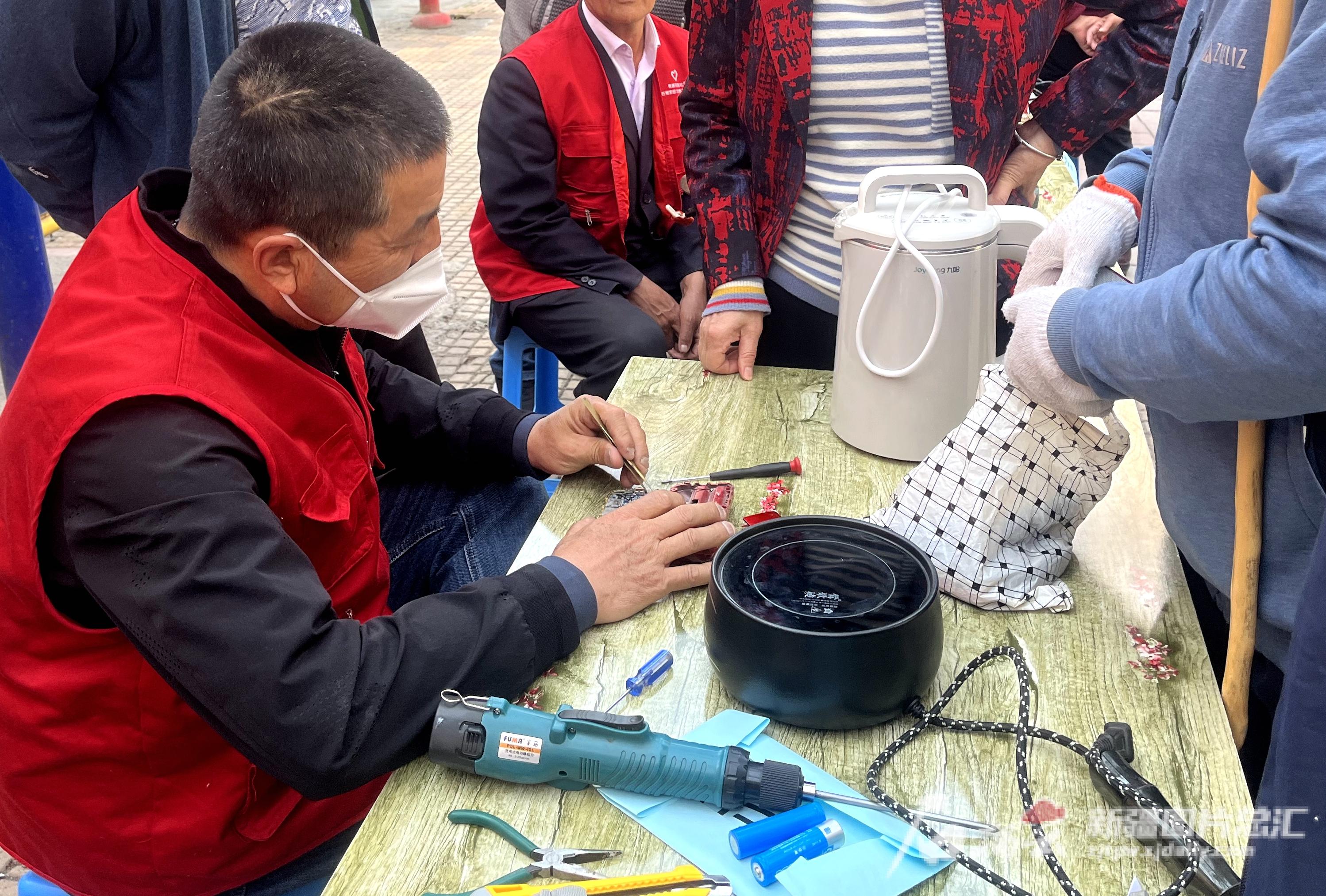 4月14日,乌鲁木齐经开区(头屯河区)中亚南路片区铁路花园社区“小修小补”便民巴扎,家电维修师傅苏万胜为居民维修小家电。王瑞摄