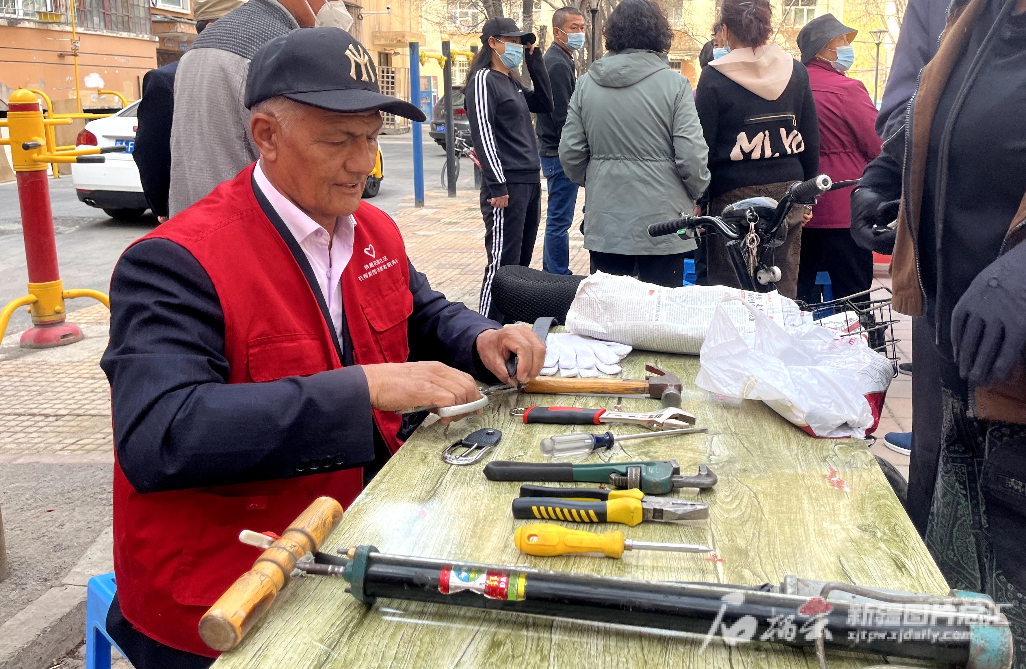 4月14日,乌鲁木齐经开区(头屯河区)中亚南路片区铁路花园社区“小修小补”便民巴扎,吾买尔江·扎依尔为居民提供免费服务。他常热心为社区居民帮忙修东西。王瑞 摄