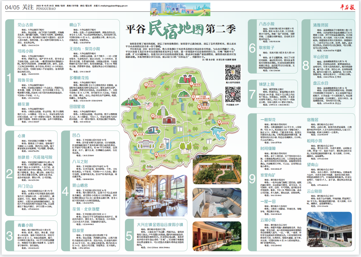平谷现有近 200 家乡村民宿,绝大多数都位于风景秀美的景区周边和乡村里面,与山水自然融于一体。平谷区依据《北京市乡村民宿服务要求及评定》标准,进一步规范乡村民宿业的经营行为,打响“桃醉平谷”品牌,扩大区域影响力,促进全区乡村民宿的高质量发展,推动乡村旅游产业提质增效,加快形成农业农村发展新动能。这些乡村民宿展示家门口的“诗和远方”,供游客打卡。