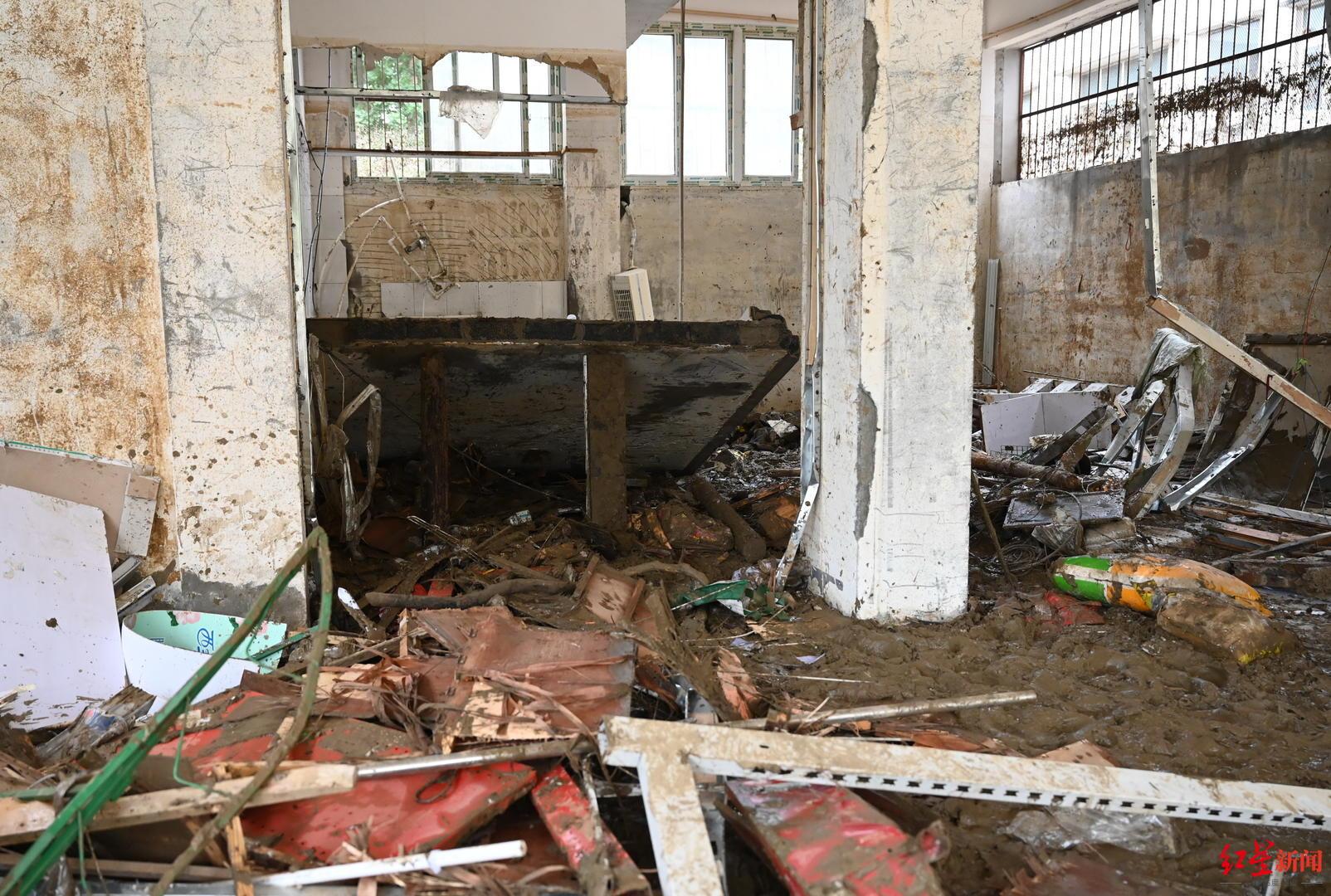22岁的赵伟在随州一家事业单位上班。自家的3层小楼位于柳林镇西南边的许家巷。灾难过后,洪水冲垮的墙体、断木和杂物塞满了临街小学教师宿舍楼和后面几栋私房之间的空地,站在这些杂物上,手可以够到二楼的窗户。“一楼的东西都没有了,冰箱、电视、家具,全部被冲走了。”赵伟告诉红星新闻,洪水冲刷后留在墙面的印记将近2.6米。洪水过后,隔壁邻居在一里之外的国道上捡回了自己的摩托车。