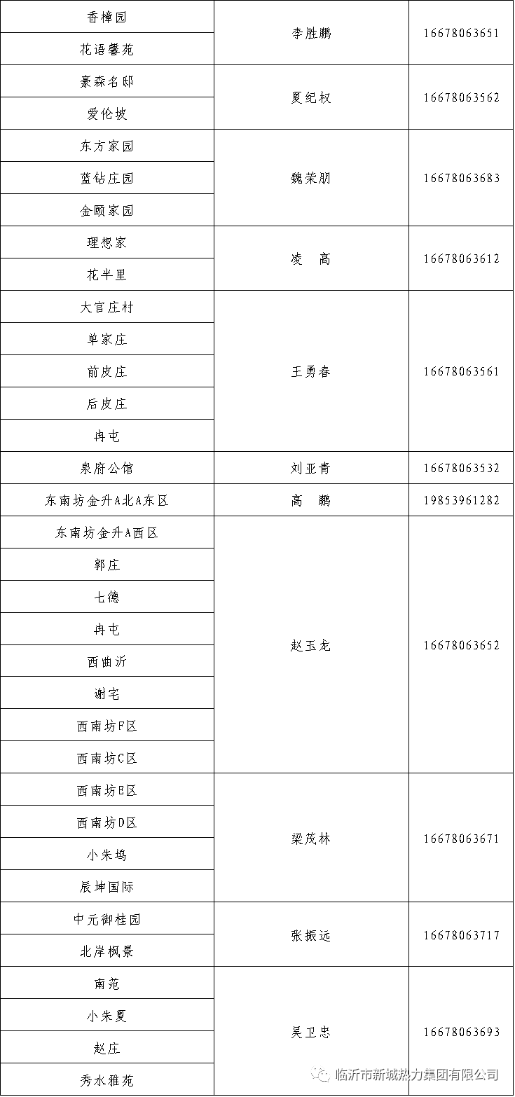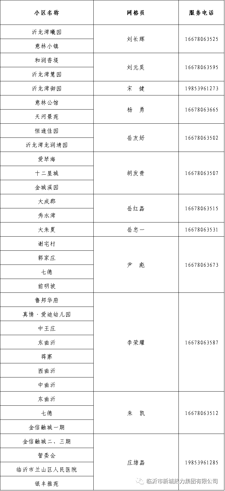 为进一步树牢以人民为中心的发展思想,切实做好居民冬季供暖用热工作,提高民生服务质量,及时有效处理热用户诉求,现将临沂市新城热力集团有限公司供热辖区网格员电话予以公布。