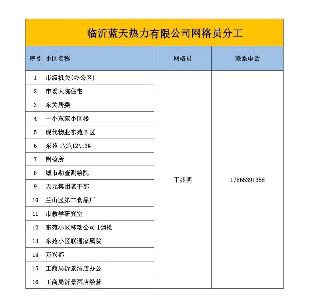 为进一步提升供热服务质量、规范服务行为,切实做好居民冬季供暖工作,及时有效解决用户诉求,现将临沂蓝天热力有限公司供热辖区网格员电话信息予以公示。