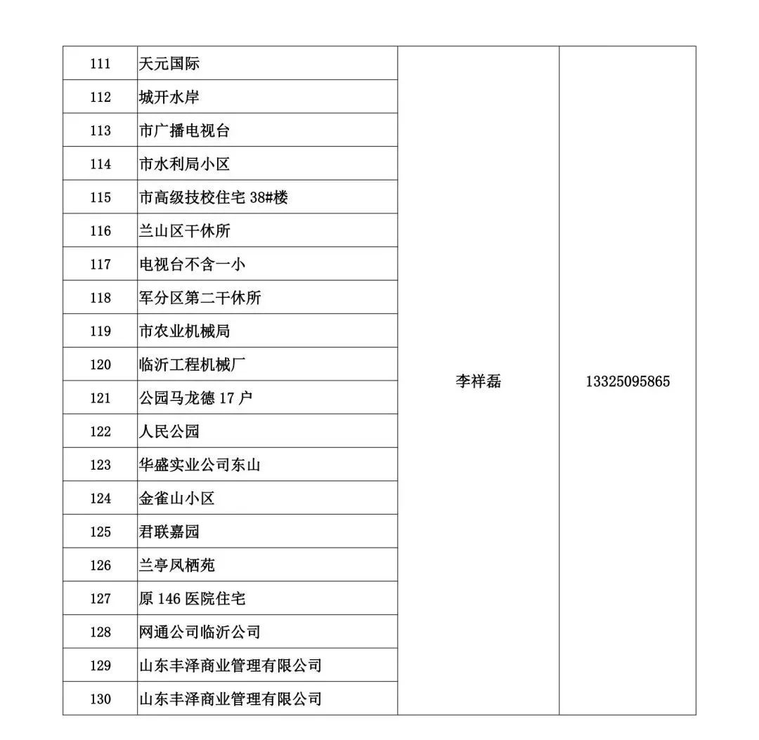 恒源供热公司2022-2023采暖季服务网格序号小区名称网格管理人员及联系电话1八一小区超市杨桂春 176629180632地税局日照房管处2#楼3济南军区临沂房管处9#楼4济南军区日照房管处5城建公司青龙河小区6电业局大厦7城建公司皇姑桥小区8供电公司皇姑桥13号楼9皇姑桥10皇姑桥2#楼11皇姑桥4#楼12交委皇姑桥小区13人民会堂宿舍14临沂钢铁厂冶金公寓15临沂市红十字会中心血站16临沂市环保局宿舍17中国银行兰山分行皇姑桥18中行临沂分行沂蒙支行19组织部老干楼20南关居委21临沂市人民会堂22兰山区建设委员会23临沂第二实验小学24临沂供电公司25临沂广播电台 殷帅杰 1766291795326临沂市国家安全局27临沂市商务局28轻工办新华路家属院29新华居委30临沂市工业生资公司31临沂市天业商贸中心32临沂市统计局宿舍33清华园小区34师范学院农校家属院35桃源大厦36华润中心 李宏 1766291767237机械组团38临沂市交通局(金雀山路)39临沂市节约能源办(鲁南医院)40临沂市农业机械研究所41临沂市农业银行(金一路)42临沂市经济和信息化委员会43临沂市城市照明管理处44涧西小区45临沂市丝绸抽纱46临沂市劳动局47临沂市丝绸公司48锦华工业贸易49临沂市烟草专卖局50沂蒙大楼51临沂久隆国际城市广场 杨桂琴 1766291779252临沂师范学院南校区53临沂市公安交警支队54临沂市规划设计院55临沂市锅炉厂56临沂市皮肤防治研究所57新华路机械公司58临沂市卫生局59临沂市渔业办公室60临沂市交通局(窑汪北)61临沂苏宁云商商贸有限公司62启阳路科委楼63启阳路老干楼64兴大公司陈庆杰 1766292255165江南映象(顺安物业)66供电公司二中家属院67临沂第二中学68永恒房产建材小区69临沂市物价局70临沂实验中学71临沂市科工贸总公司72临沂市成祥公司73华润凯旋门李延青 1766292213774万象汇丁晨 1766291778375银都小区76临沂市金猴房地产开发有限公司77临沂建设银行广场支行78临沂市公安局范一泰 1766291767379临沂市兰山区机关事务服务中心80临沂市市民活动中心81发改委开阳路家属院82广场世纪城83金鼎国际广场公寓楼84金属公司家属院85鑫都花园高芝:1766291778286百合园87巧克力都88三元小区89金泰嘉苑90全季酒店91三合园92公元锦里93大成家苑许永涛 1766291757294旭阳花园95华馨园叶文 1766291765196中铁十一局97恒基宿舍98204项目办99国土局宿舍100外贸丝绸101物价局102商务局103苎麻厂家属院104五里新村李艳:17662917791105三通花园106豪情花园107吉祥花园108五里堡嘉欣小区109七里园110明馨小区孟祥阵 17662922553111电业局车队112临西农行113赵**114商城路明馨车队115盛合园116海天花园117盛世春晖118西苗庄浴池119西苗庄浴池北巷120热电西区北区家属楼121苗庄北区散户122人保财险123蒸汽散户124中国人保财险兰山支公司125中联四路126七中家委127银泰景苑 幼儿园詹庆泉 17662922165128三合泰城129汉庭酒店130天和粮油131天和粮油恒源家属院132万顺公寓133永恒房产天和粮油小区134鲁商金悦城一期张涛:17662917573135鲁商金悦城S02136鲁商金悦城二期137房源印象赵健侠 17662921957138盛世春天139台北新城140苗庄农贸141金苗园赵晓 17662922163142兰苗园143蒙山社区委员会144苗庄小区145苗庄新区浴池146蒙山社区委员会147苗庄南区恒源家属院148银苗园149苗庄交委孙传文 17662921183150银凤花园廉租房151银凤花园152翔龙国际153美多花园154银凤东苑155机务段156汉庭酒店157东关A区 刘庆龙 17662917591158龙庭帝景159瑞沂蓝山薛国庆 17662922097160东风东关B区161东风东关C区刘艳 17662917650162东关E区颜廷绪 17660573871163东关F区164鲁班花园165军分区干休一所166军营家园167粮油机械厂168书院社区169书院小学家属院170普村清河园A区赵尊权 17662917652171普村清河园B区172站前小区南区虞笑 17660573878173站前小区北区174康居嘉园175焦庄花园A赵丽 17662917570176焦庄花园C177傅屯嘉园178城开景悦179中国人民解放军94326部队75分队180焦庄花园B苏勇豪 17662918371181焦庄佳园182新闻宿舍于丰赫 17662918352183临沂市审计局184临沂市统计局南山宿舍185沂沭河管理处宿舍186兰山区城市开发建设投资集团有限公司187临沂市区国税局家属院188临沂市区国税局人民银行家属院189沁园春茶叶店+临商别墅190中国联通家属院191金昌花园192军队干部转业中心(人事局)193临沂市司法局194临沂市中级人民法院195市文化市场管理执法局(新闻出版局)196三里庄小区刘士珍 17662918305197临沂市妇幼保健院198山东医学高院附属医院199铁路公寓200山东临沂烟草有限公司(兰山)201临沂金石置业202玉山小区203临沂市财政局204刘**205临沂市武警支队206临沂军分区干休三所207兰山区公路管理局208环保局209临沂市丝绸公司(金雀山)210金雀新城B区郑洪磊 17662917950211阳光里212埠东花园西区张磊 17662921897213人民银行214宝德集团(原开元集团)215临沂市散装水泥办公室216临沂市翔龙集团217临沂市供销果品盐业公司218临沂市国税局新和小区219金叶酒店220供销社老干家属院221临沂市土产棉麻公司222供电公司埠东南院223临沂市公共交通总公司224临沂市公共交通总公司-金坛花园225金雀山街道南坛社区居委会226建筑业管理办公室67227金坛小区60号楼228兰山区农行金坛宿舍51.52.53229临沂市人民法院(金坛小区55#)230兰山区政府人大南坛宿舍63.64231临沂车务段54232临沂市交通局(金坛小区)46233南坛小区65号楼234南坛小区62号楼235农业综合开发办(农委)-金坛小区(56、57、