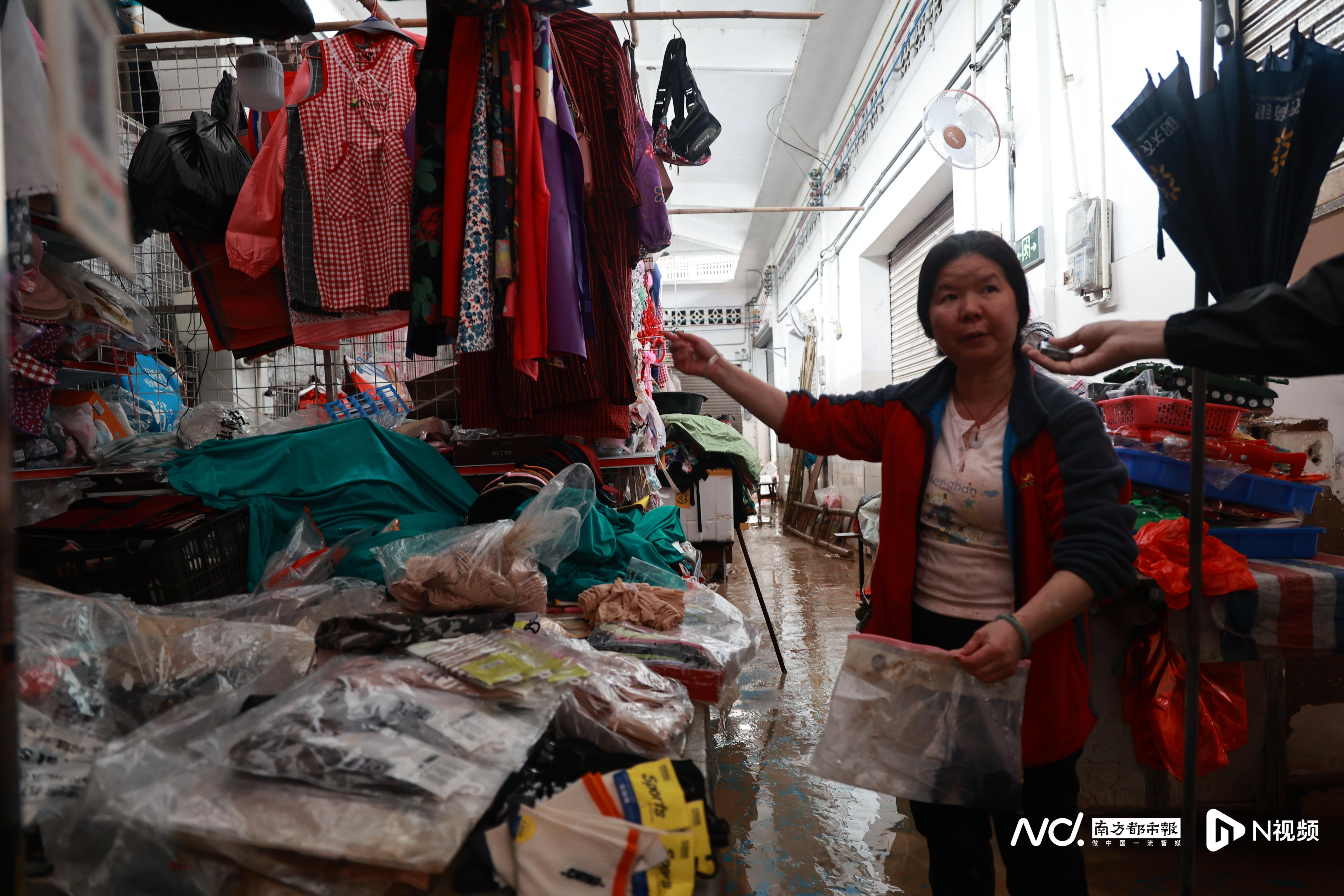 市场商户向记者介绍自家衣服档口的水浸情况。