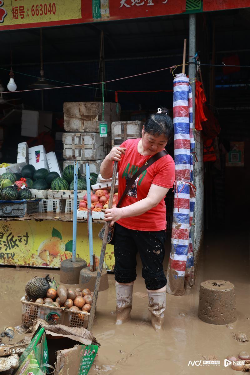 多图直击韶关龙归镇,水位逐渐下降,市场商户清理淤积垃圾
