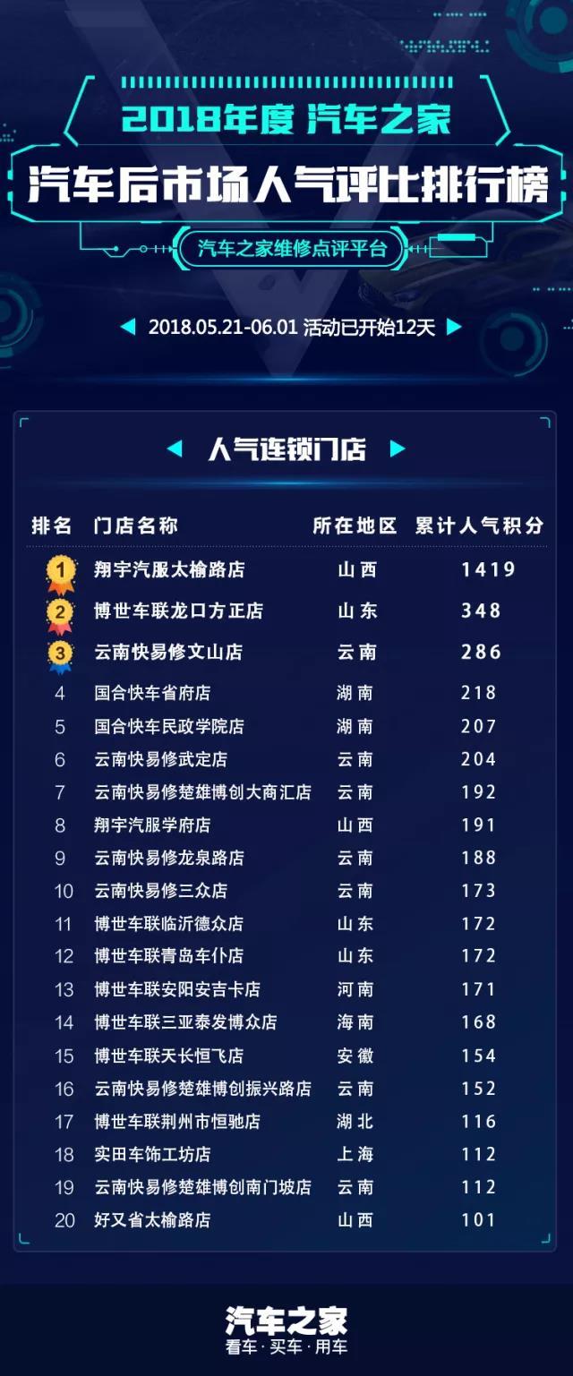 此次排行榜在反映门店人气的同时,也在一定程度上表明大家对于汽修连锁品牌的偏好。究竟花落谁家,让我们拭目以待吧