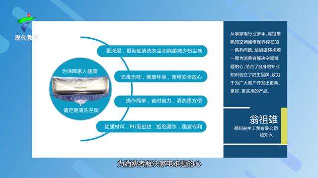 相信每位观众朋友的家中都有空调这种不可缺少的家电产品,这些产品为我们带来便利和舒适的同时,它们的清洗和保养问题也在困扰着我们。本期栏目邀请到的嘉宾,福州进生工贸有限公司创始人翁祖雄先生,他以多年从事家电行业的经验,为我们研发出了新型又便利的空调清洗产品。