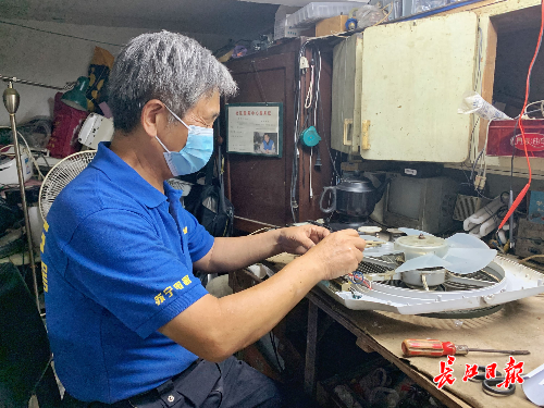 19日下午,北湖街和风里小区“红山花刘师傅电器修理店”内,72岁的刘小春握着钳子和起子,正在对一台拆解开的老电扇进行“手术”:“夏天是修电扇、空调的高峰期,每次修理都得抓紧,不然影响人家生活。”