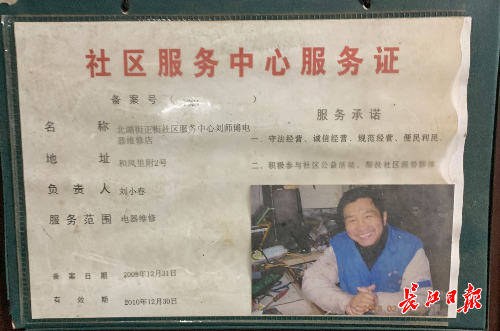 刘小春的店面在一栋居民楼的半地下室,长江日报记者看到,并不宽敞的空间里,堆放着电扇、电视机、电饭煲、收音机等家用电器。工作台的一侧,挂着一张十年前的“社区服务中心服务证”,塑封内的纸张有些泛黄,但“守法经营、诚信经营、规范经营、便民利民”“积极参与社区公益活动,帮扶社区弱势群体”等字样依然清晰。