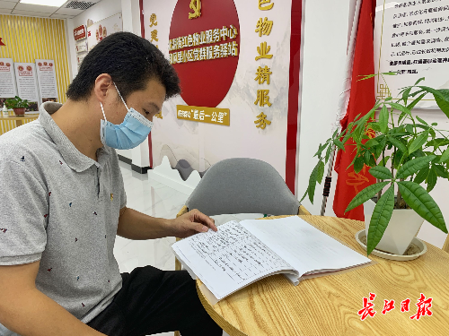 北湖街红色物业服务中心负责人刘威向记者展示报修手册记录。 长江日报记者乔驰 摄