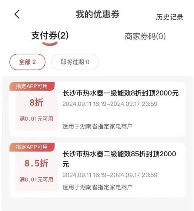 也可以直接返回云闪付APP的首页,找到“我的——优惠券”,就可以看到优惠券详情,每类产品券包含一级能效和二级能效补贴券各一张。