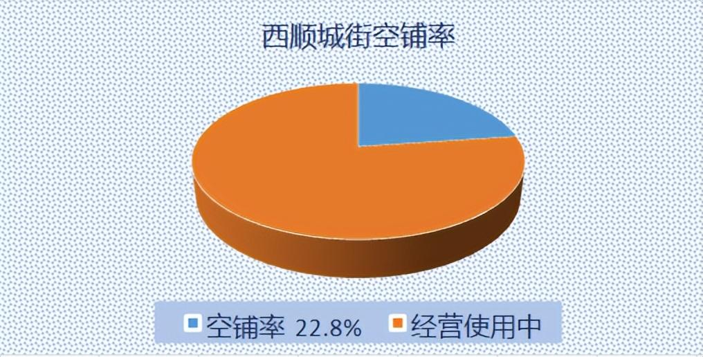 西顺城街的空铺率为22.8%,高于有统计数据的空铺率平均值。也是盛京方城东、西、南、北四顺城街路中是最高的。