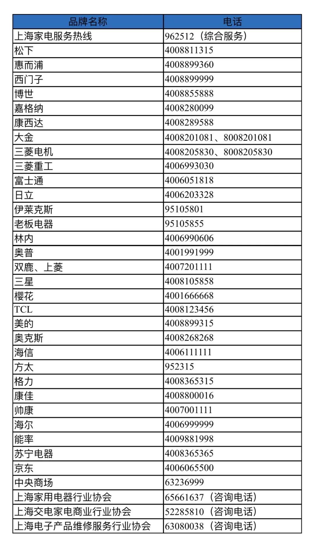 主要家电维修企业联系方式
