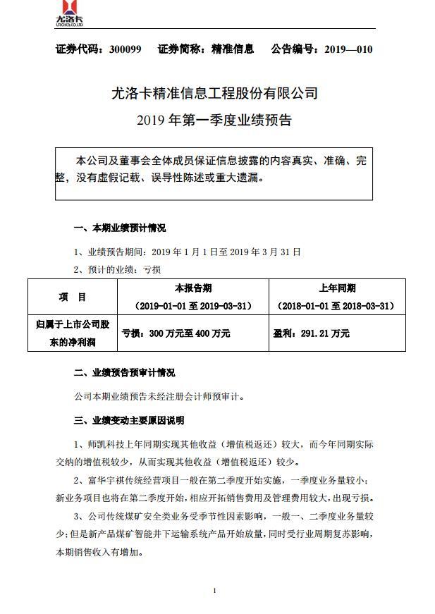 精准信息(7连板)公告,预计一季度亏损300万-400万元,上年同期盈利291万元。