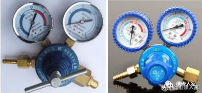 减压器装在氧气瓶口上,并设有高压表和低压表,其作用是使钢瓶内的高压气体输出后变为工作用的低压气体,同时能够使输出的气体压力维持在所需要的固定工作压力的范围,以适应气焊时的需要。