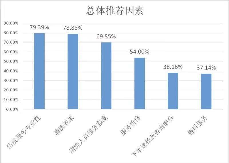 NPS口碑调查的各维度数据显示,清洗服务专业性是消费者选择家电清洗平台的首要原因。排名二三位的推荐原因分别为清洗效果和清洗人员服务态度,表明消费者更加青睐清洗服务更专业、清洗效果好、服务态度好的平台。