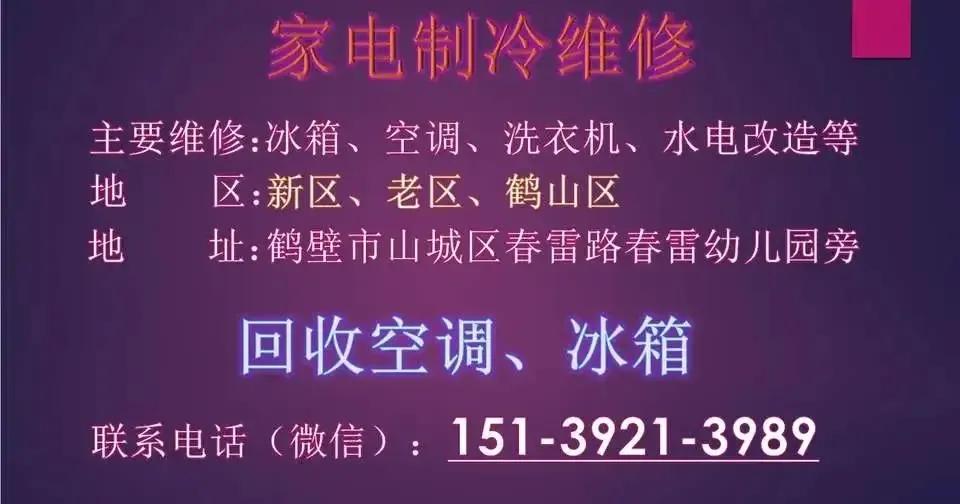 鹤壁市老区春雷路按摩医院南侧40米,有一家店,叫家电制冷维修。可以上门维修各种家电,冰箱、空调、洗衣机,水电改造,拆装空调(包括淇滨区,山城区,鹤山区),充氟,同时也可以回收空调、冰箱。有需要的可以去看看。