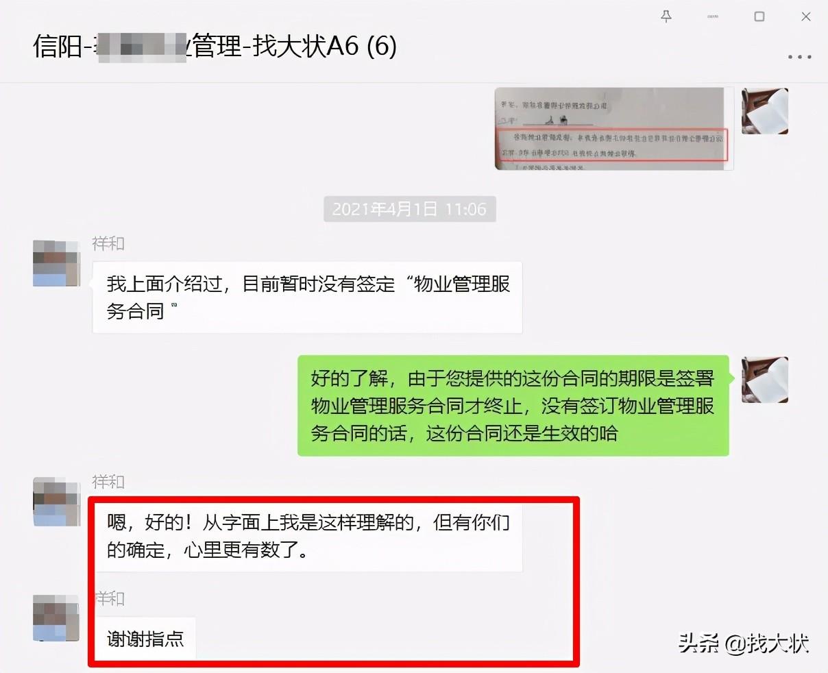 服务详情:法务人员与客户沟通后,建议客户提供与对方当时签署的合同,客户提供了一份《前期物业服务管理协议》,表示仅与业主签订了这份协议,没有签署正式的物业服务合同,问法务这份合同是否仍然生效。法务仔细查阅了合同内容,找到一条款写明了合同期限,该合同效力至签署物业管理服务合同方才终止,就有了如下截图中的对话。