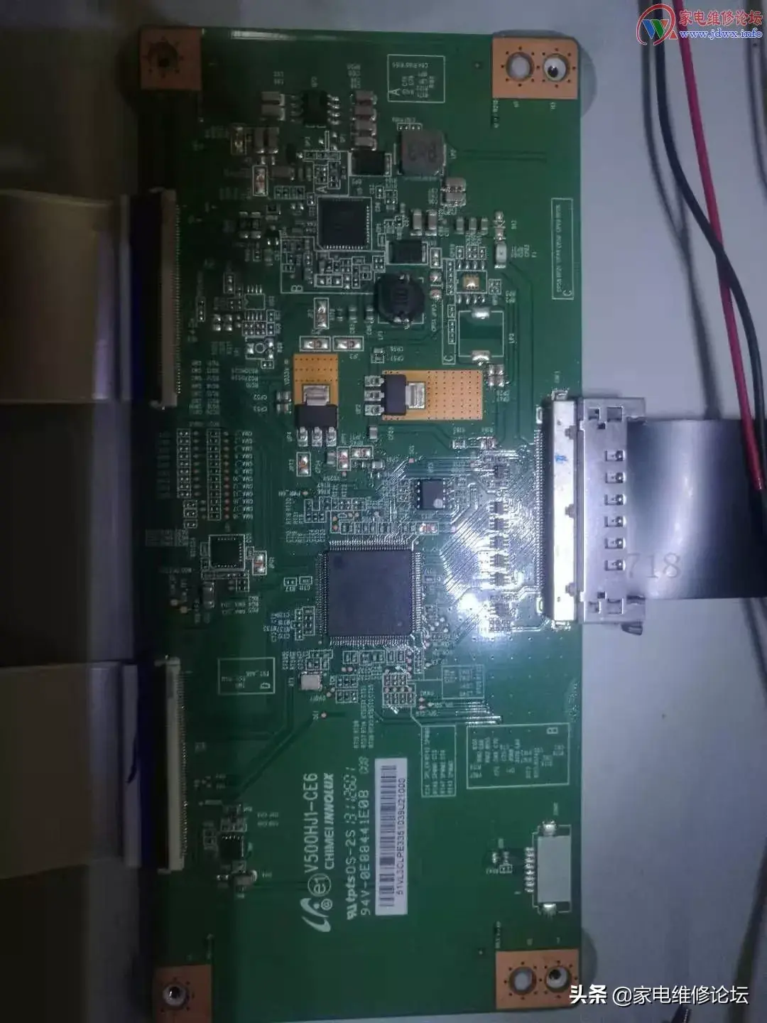 奇美58寸液晶模组灰屏显示,声音正常。由于平时积累过不少液晶知识,直接拆开测量逻辑板工作电压,VGH=0 VGL=0 VCC=12V ,芯片无发热烫手现象, 逻辑板有2条排线接了液晶2个边板。