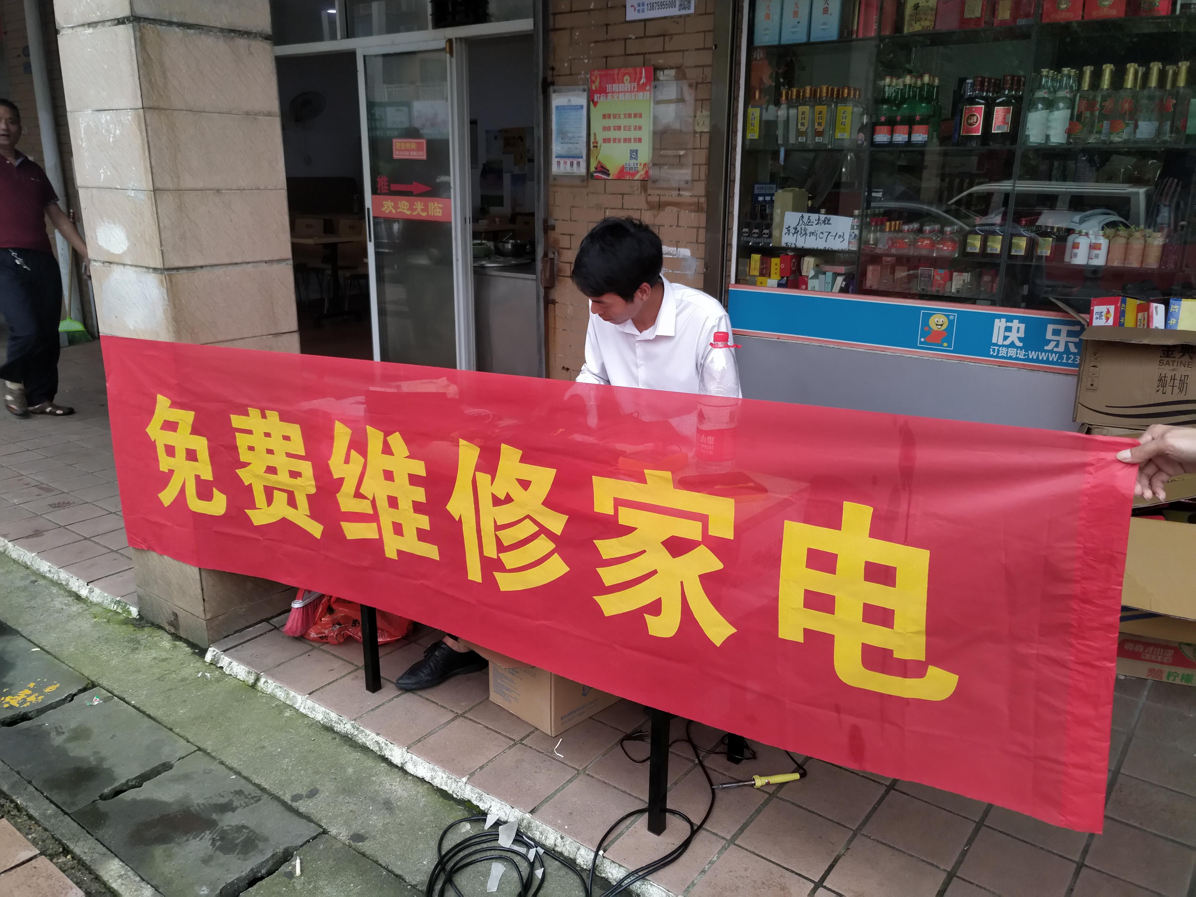 这次他是从7月11日就开始免费维修家电,由于小区没有场地,他还只好将摊位摆在超市门前,为此还给超市老板出了场地费。