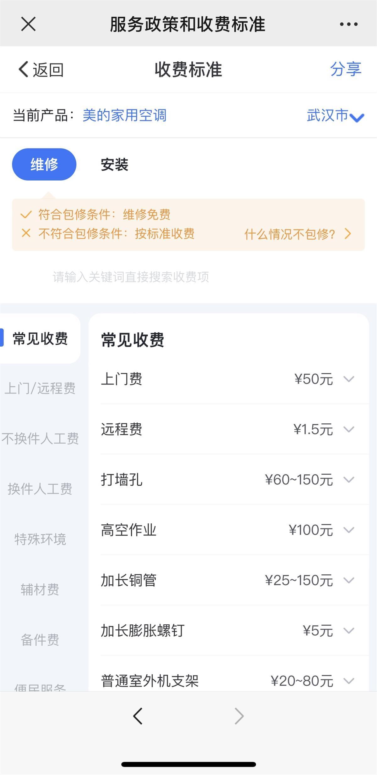 美的家用空调维修武汉地区收费标准(网络截图)