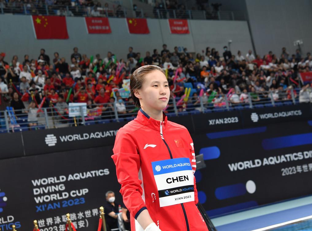 4月16日,陈芋汐在比赛前步入场内。当日,在陕西省西安市奥体中心举行的2023年跳水世界杯西安站女子10米台决赛中,中国选手陈芋汐以431.20分的成绩获得冠军、中国选手全红婵以423.50分的成绩获得亚军。新华社记者 张博文 摄