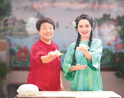柳青瑶(右)身穿绿色老软缎改良旗袍与烟台市胶东花饽饽非遗传承人曲丽荣录制电视节目。
