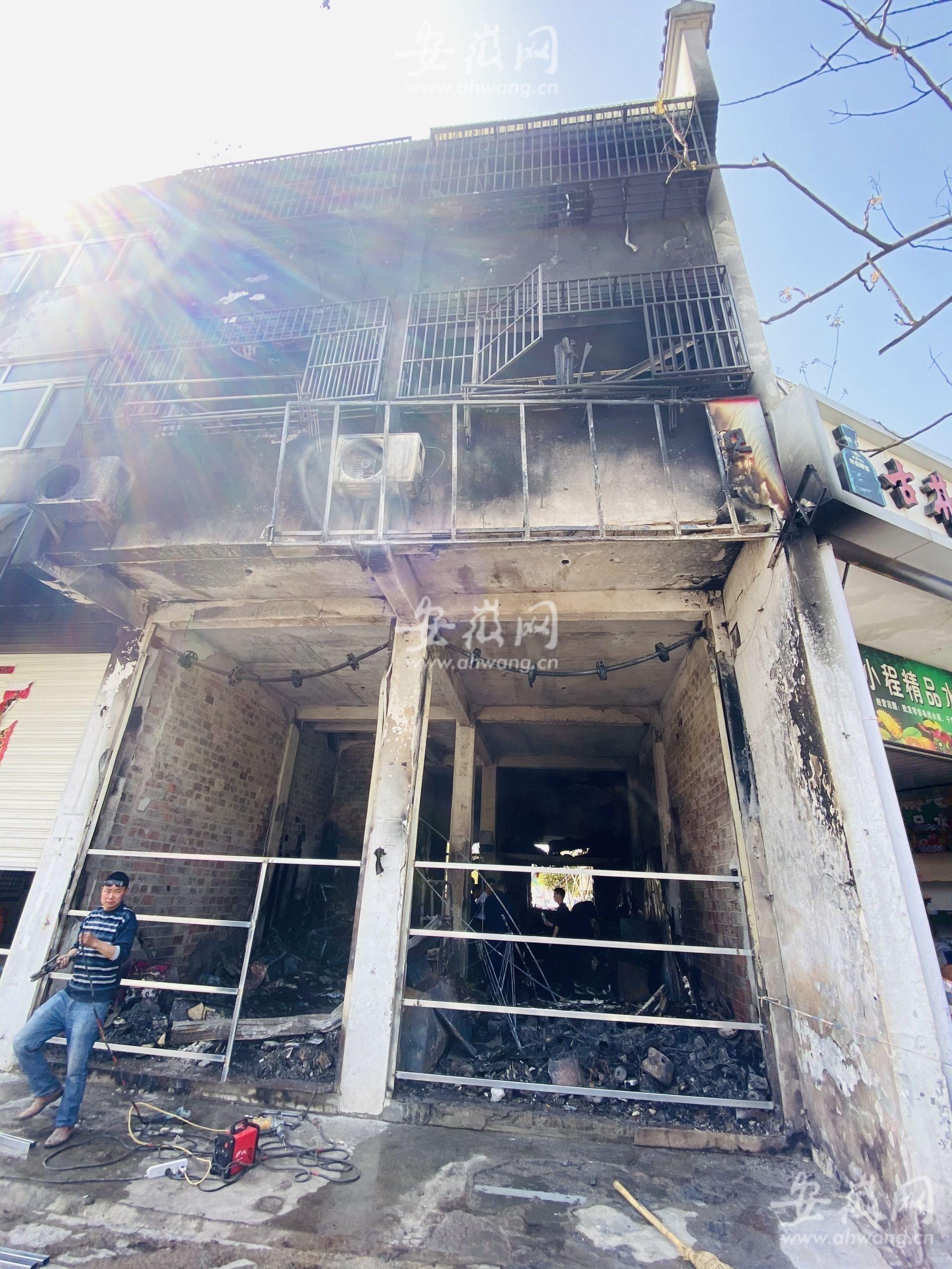 站在警戒线外,新安晚报、安徽网、大皖新闻记者看到,一楼的商铺内一片狼藉,能看到一些被烧得面目全非的家电,还有一些尚未被完全烧光的玩具等物品。这栋三层楼的房子外墙被熏得漆黑一片,一楼商铺的两道卷闸门已经被拆除。