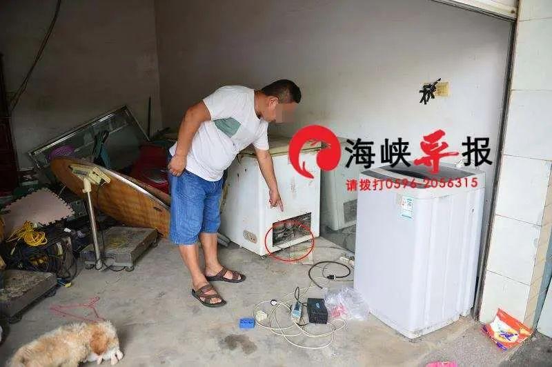 杂物间门口,放着一个火盆,罗先生拉开了杂物间的卷闸门,一台比较旧的冰柜靠墙摆放着。