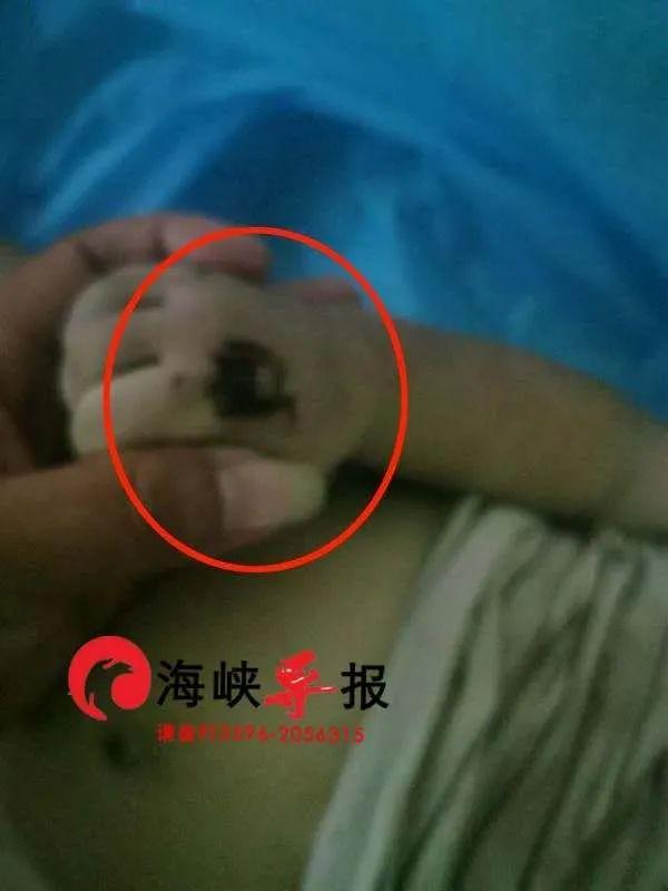 据罗先生提供的图片显示,男童的左手手腕处有一圈焦黑的印迹,右手手背上,也有一处焦黑的印迹 。