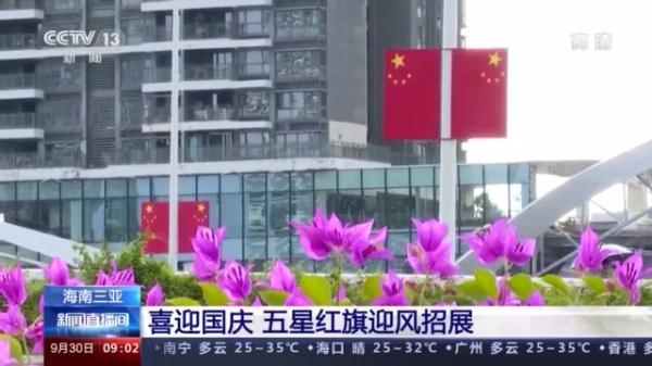 在海南三亚,主次干道灯杆上已经挂起了国旗,一面面鲜艳的五星红旗迎风飘扬,街头处处洋溢着浓浓的节日氛围。此外,鹿回头风景区将在10月1日至3日为游客们特别奉献《红色娘子军》演出,传递对祖国的祝福。