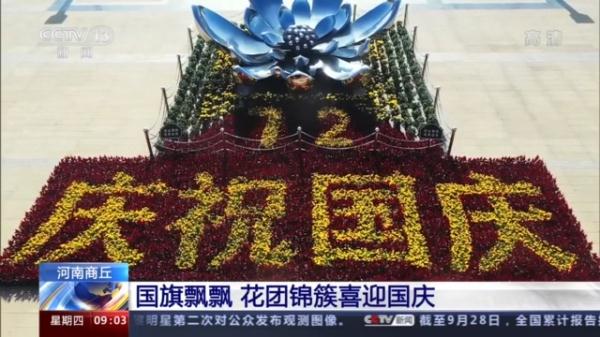 在河南商丘,园林绿化工作人员用12000多盆彩叶草等花卉,拼成巨大的“72 庆祝国庆”字样景观造型。主题造型与各色鲜花交相辉映,庆祝新中国成立72周年。在道路两旁,鲜艳的五星红旗迎风飘扬,营造出喜庆祥和的节日氛围。