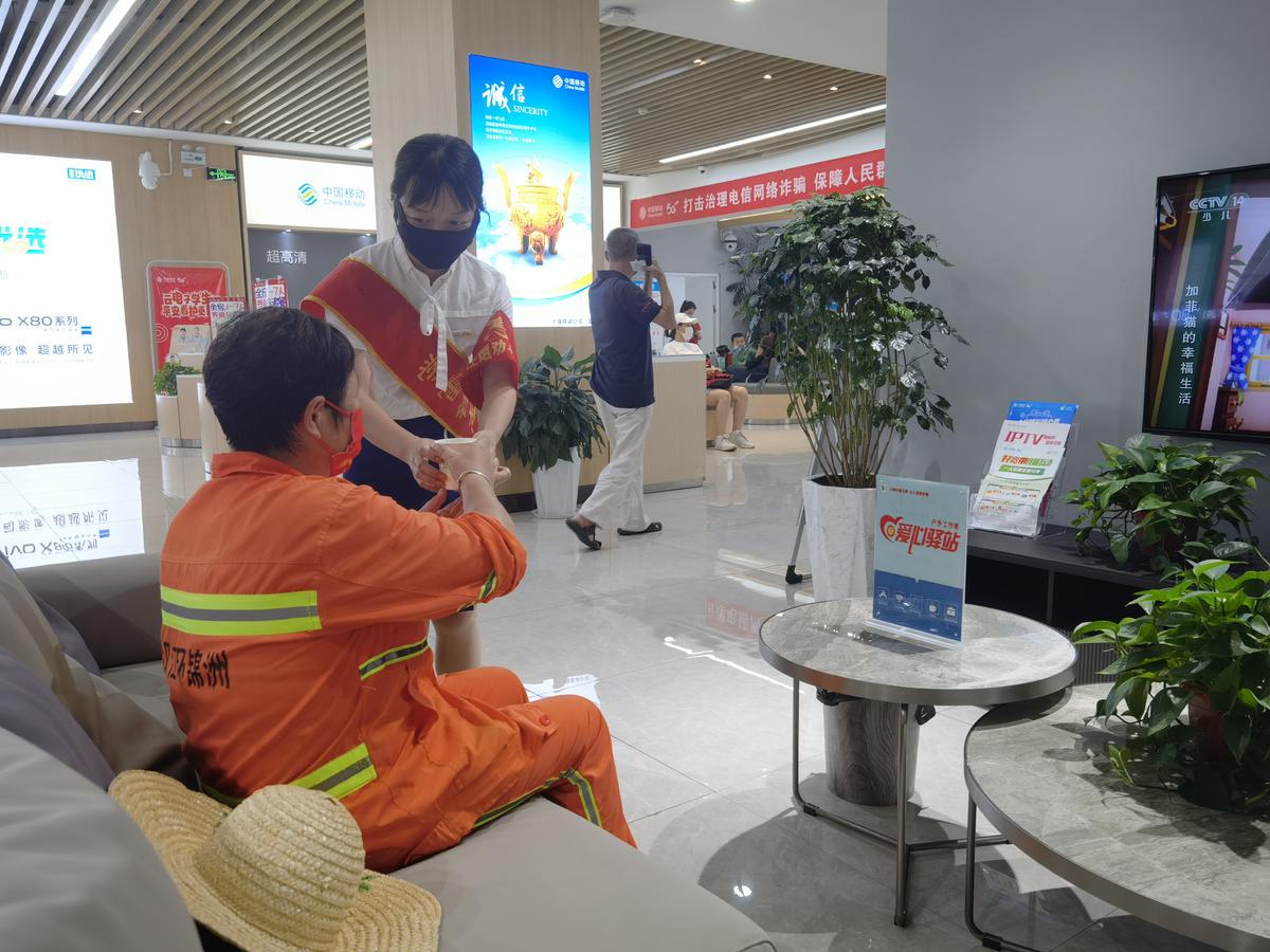 8月的江城,骄阳似火。为致敬高温下的户外劳动者,武汉移动加入公益爱心企业行列,在全市直营店营业厅设立“爱心驿站”纳凉点,欢迎交警以及外卖小哥、环卫工等烈日下坚守岗位的户外劳动者们来此歇歇脚,感受这座英雄的城市有爱关怀。
