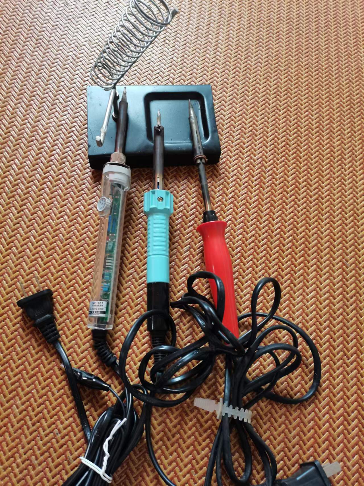 四、电器维修工具。 这里的工具比较杂,主要有电烙铁、吸锡器、热风枪、热熔枪、LED灯检测拆焊套装工具、干电池螺丝拆除工具套装。还有早期修理电话机用的电话传真测试仪、遥控器发射测试仪。电容容量表,还有网线水晶头制作工具。