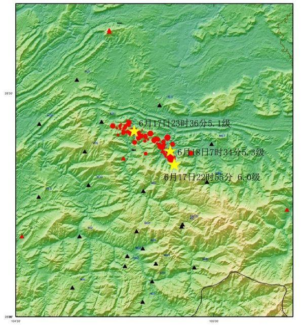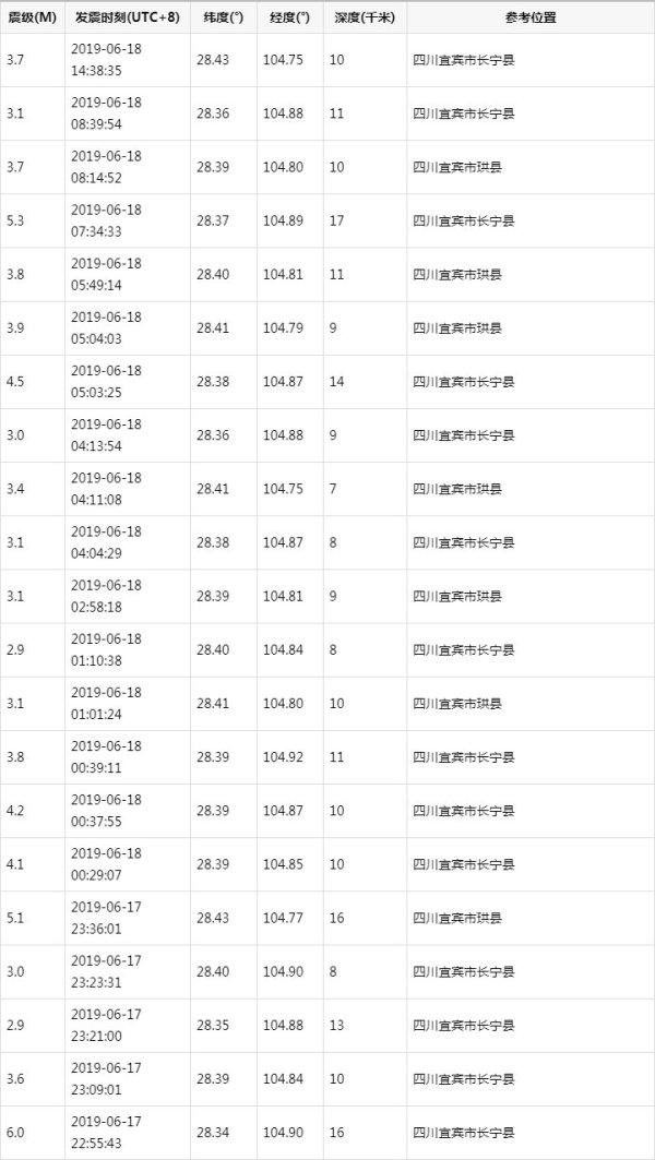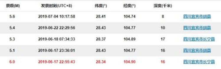 根据中国地震台网记录,6月17日22时55分,四川省宜宾市长宁县发生6.0级地震后,不到1小时,附近的珙县就在当晚23时36分发生5.1级地震;6月18日早上7时34分,长宁县又发生5.3级地震;6月22日22时29分,四川宜宾市珙县发生5.4级地震。