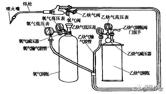 气焊设备是维修制冷设备时的基本工具,在更换制冷系统元器件、连接管路、修理阀、压缩机充气管及对压缩机充气口进行封焊时使用。气焊设备简单、使用灵活,对铸铁及某些有色金属的焊接有较好的适应性,且在电力供应不足的地方需要焊接时,气焊能发挥较大的作用。但气焊的生产效率较低,焊接后元器件易变形。