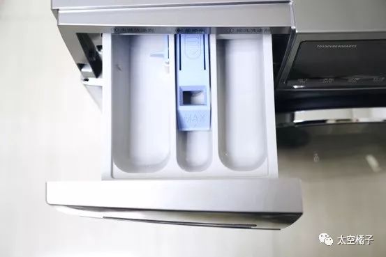 洗衣机的正面做了黄金分割,上半部分是洗衣机的操作区,分别是分配器盒、液晶面板和功能按钮。