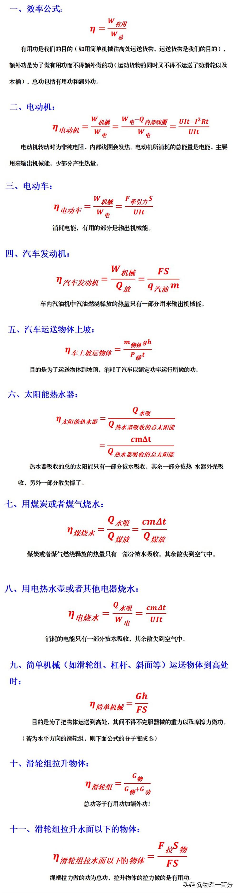 八、一张图概括初中物理所有“效率”问题!解决掉压轴题的关键一问! 作为最常考的初中物理知识点之一,相关的各种“效率”问题常常伴随着压轴题出现,而且常常作为压轴题的最后一问。 凡是无法理解各种效率的物理意义的同学,此类题十之八九要出错。 理解并掌握住下方这些公式吧,一切此类问题迎刃而解。