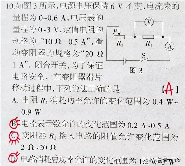 解决此类问题的突破口或者说诀窍就是:先求出滑动变阻器的最大阻值和最小阻值! 本题中,当滑动变阻器的阻值变小时,电路中的电流变大,就有可能烧坏两个电阻和电流表 当滑动变阻器的阻值越大,电路中的电流越小,电压表两端的电压也越小,所以此时所有元件都越安全! 也就是说,只要找准滑动变阻器的变化范围这个突破口,一切都变简单了。