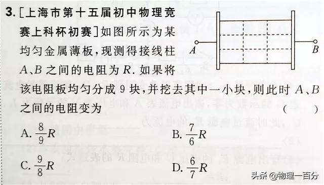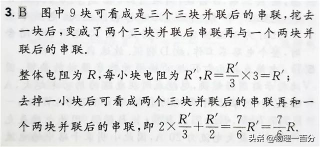 对于本题,我们可以把这九个电阻看成左三并联、中三并联、右三并联,再把这左中右三部分串联起来。当挖去左三电阻中的一个电阻后,就相当于左二并联、其余不变,最后三部分串联。 如此理解是不是就很容易解决了? 当然我们也可以采用其他类似方法,把这九个电阻看成上三串联、中三串联、下三串联,再把这上中下三部分并联起来。当挖去上三电阻中的一个电阻后,就相当于上二串联,其余不变,最后三部分并联。 就是这样有些脑筋急转弯似的物理题,还真的比较能够训练初中生们的思维应变能力,能否把所学物理电学知识迁移到本题,能否把本题的几部分电阻等效为串并联的电阻是关键所在!